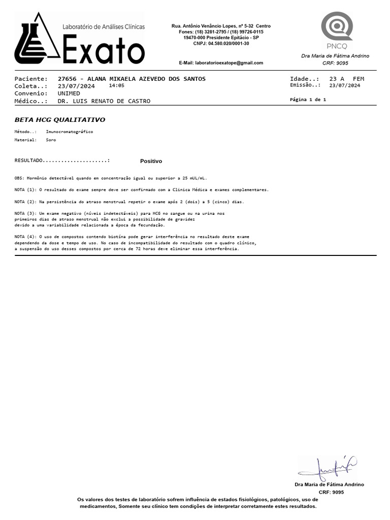 NOTA (1): O resultado do exame sempre deve ser confirmado com a Clinica Médica e exames complementares.
