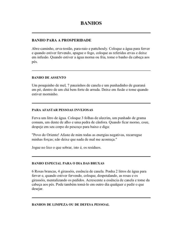 Este documento fornece instruções para vários tipos de banhos, incluindo banhos para prosperidade, afastar negatividade, atrair amor, ter energia, tirar olho-grande, ter dinheiro, afastar depressão, atrair riquezas, esquecer alguém e limpeza pessoal. Os banhos envolvem ferver água e adicionar ervas, flores, especiarias ou outros ingredientes naturais para criar infusões com diferentes propósitos espirituais ou materiais.