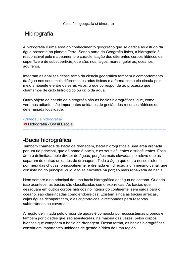 água presente no planeta Terra. Sendo parte da Geografia física, a hidrografia é