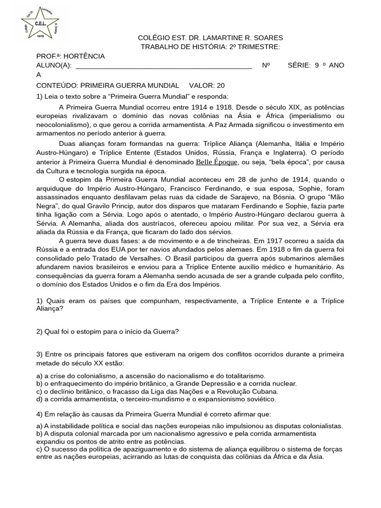 1) Leia o texto sobre a “Primeira Guerra Mundial” e responda: