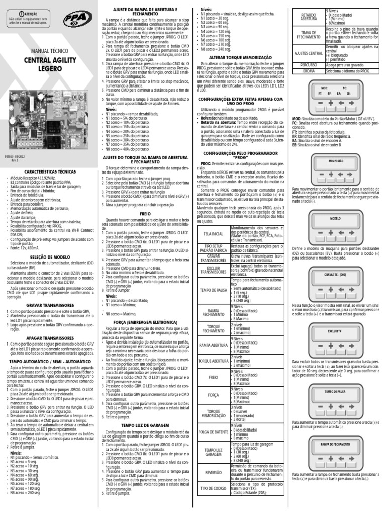 • Tempo de retardo para abertura com sinaleira; Quando houver comando para desligar o motor o freio ou ajustes.
