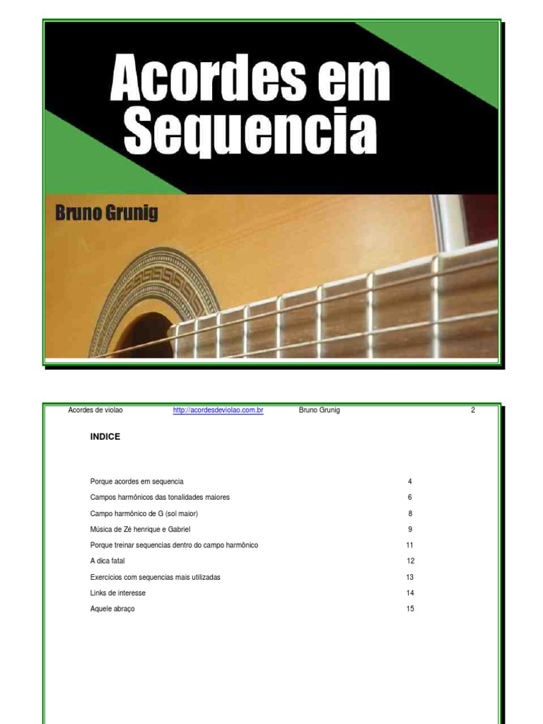 Nesta apostila, voc tem em mos a melhor maneira de conhecer e treinar os acordes. Nas sequencias originadas do campo harmnico de cada tonalidade. Desta maneira, Voc no precisa ficar aprendendo msica por msica. Voc vai acostumar-se a saber quais acordes podem estar presentes na msica. Isto impagvel. Voc, ao se deparar com uma nova msica, poder facilmente comear a toc-la, apenas sabendo em que tonalidade est. claro que antes disso voc precisa conhecer e treinar as sequencias. Que aqui esto. Boa sorte Bruno Grunig