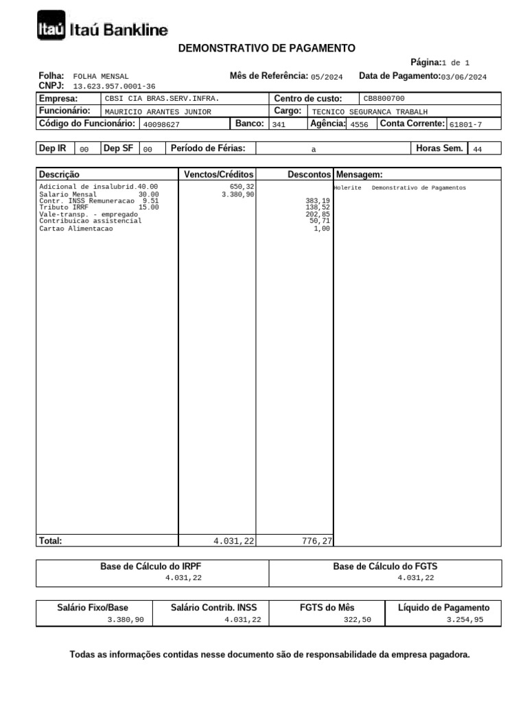 Todas as informações contidas nesse documento são de responsabilidade da empresa pagadora.