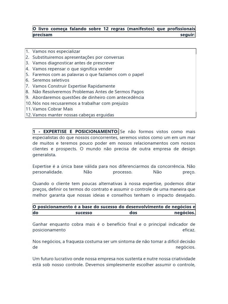 O livro começa falando sobre 12 regras (manifestos) que profissionais