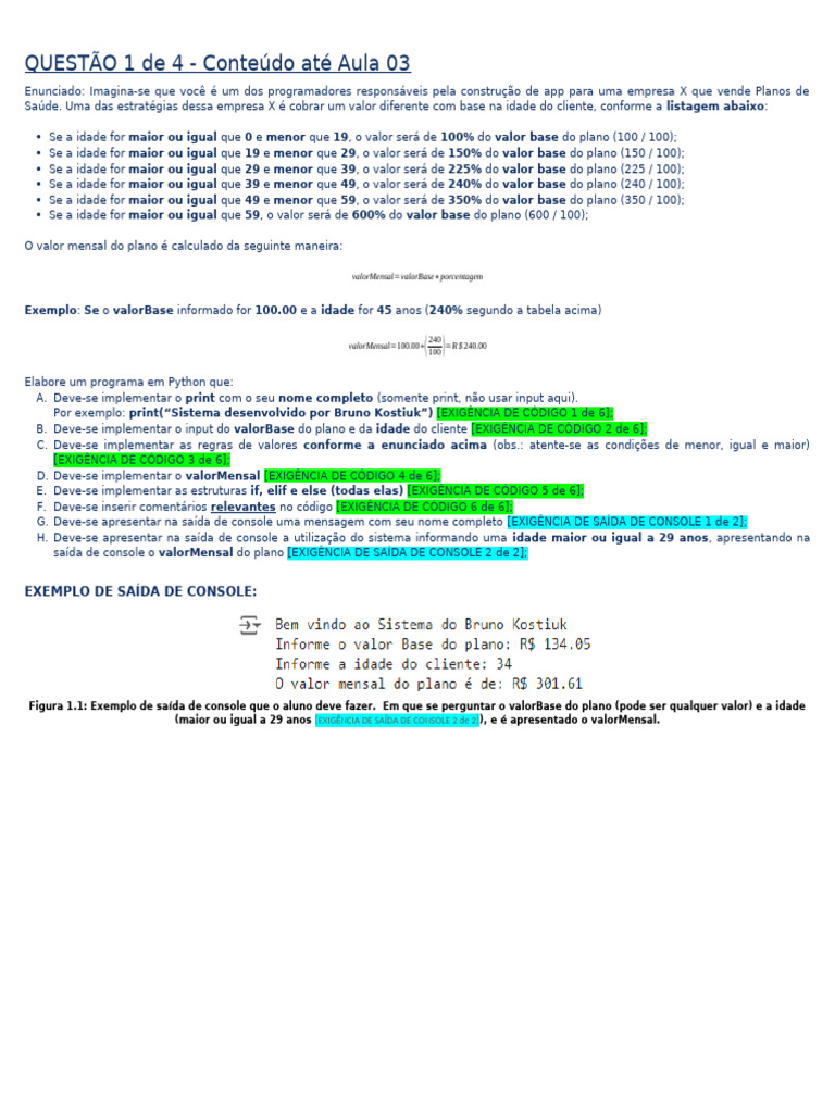 Por exemplo: print(“Sistema desenvolvido por Bruno Kostiuk”) [EXIGÊNCIA DE CÓDIGO 1 de 6];