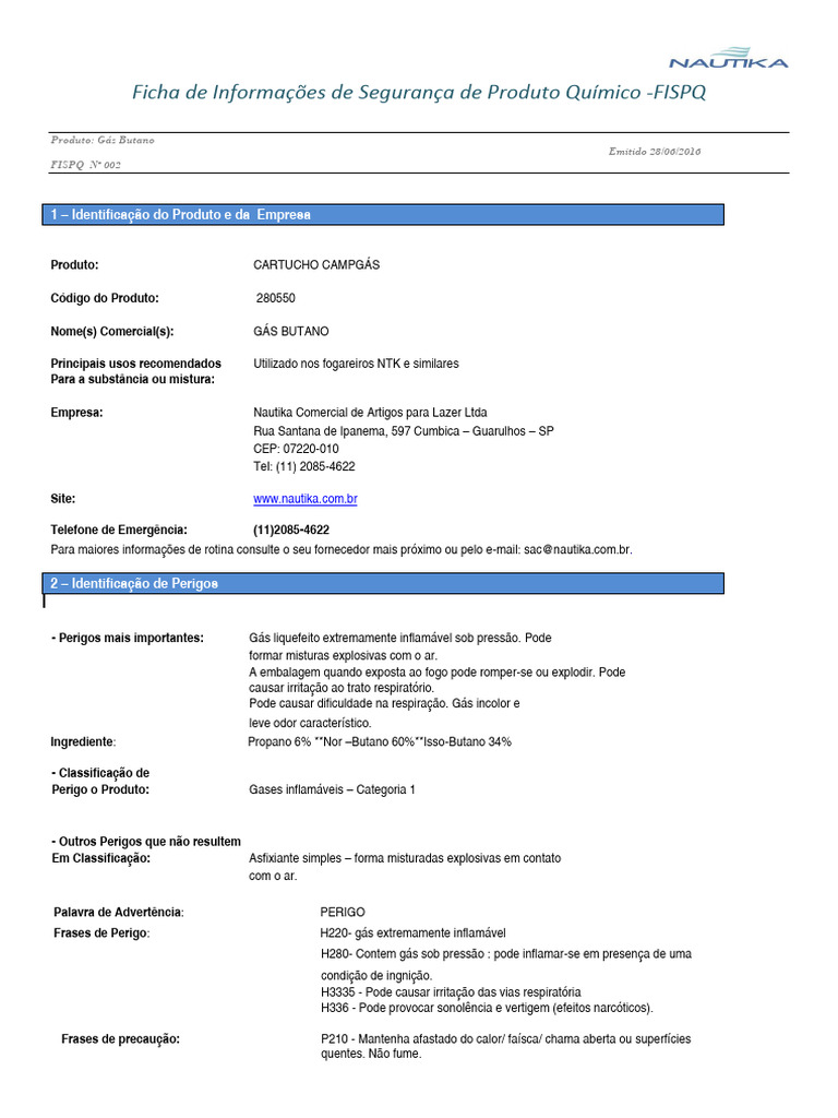 Ingrediente: Propano 6% **Nor –Butano 60%**Isso-Butano 34%