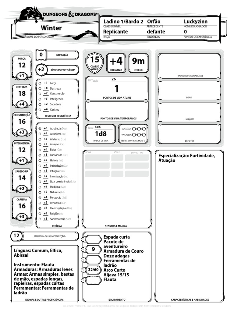 NOME DO PERSONAGEM RAÇA TENDÊNCIA PONTOS DE EXPERIÊNCIA