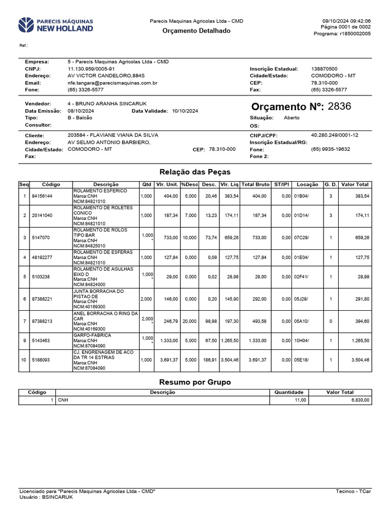 Cliente: 203584 - FLAVIANE VIANA DA SILVA CNPJ/CPF: 40.280.249/0001-12