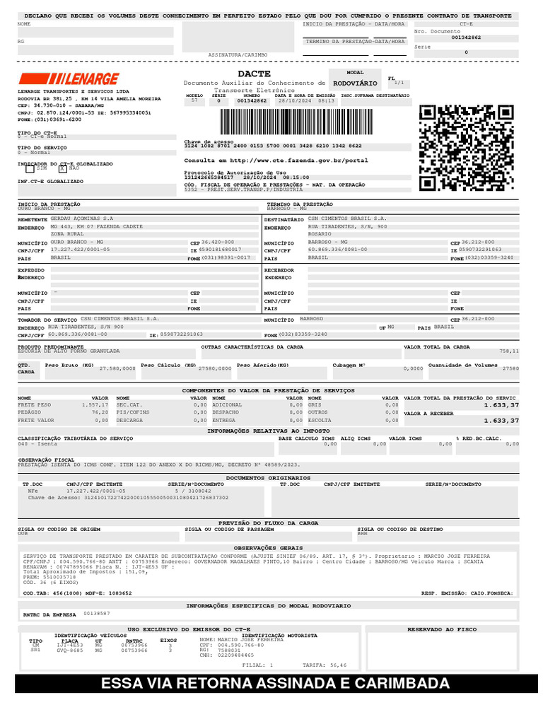 RODOVIA BR 381,25 , KM 14 VILA AMELIA MOREIRA 57 0 001342862 28/10/2024 08:13
