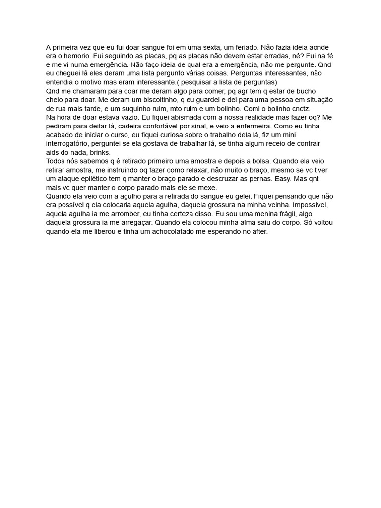 A primeira vez que eu fui doar sangue foi em uma sexta, um feriado.