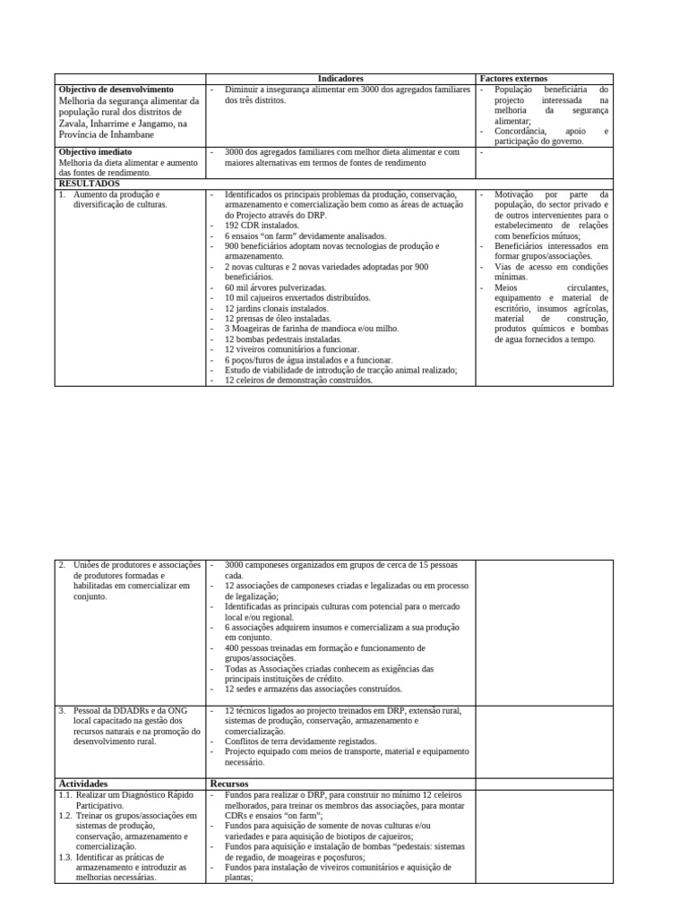 Objectivo de desenvolvimento - Diminuir a insegurança alimentar em 3000 dos agregados familiares - População beneficiária do