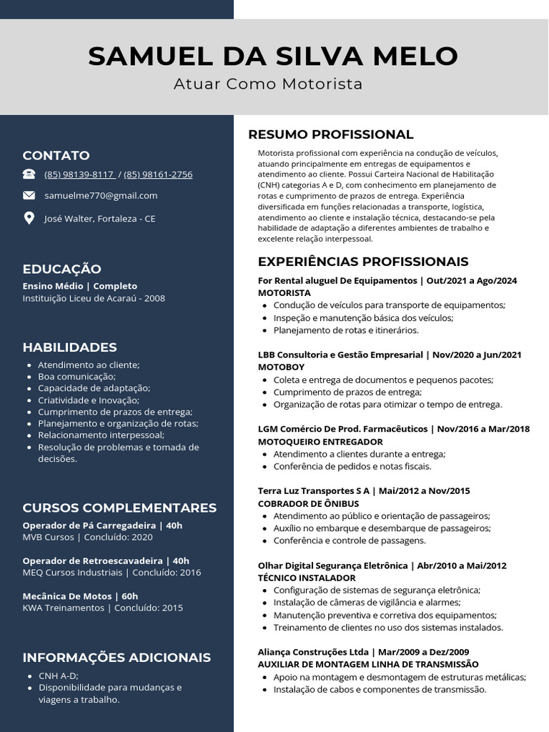 (85) 98139-8117 / (85) 98161-2756 atendimento ao cliente. Possui Carteira Nacional de Habilitação