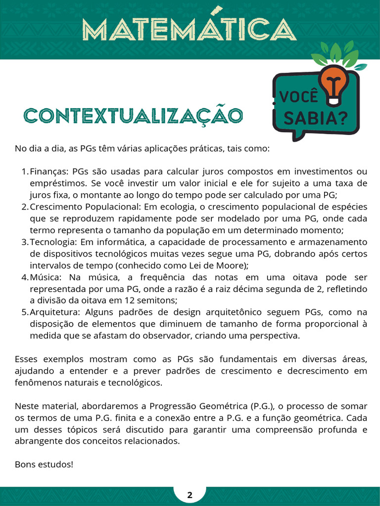 Neste material, abordaremos a Progressão Geométrica (P.G.), o processo de somar