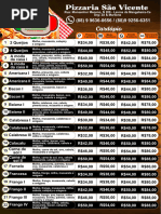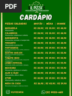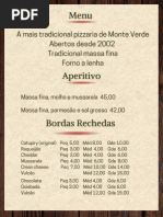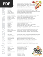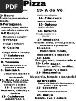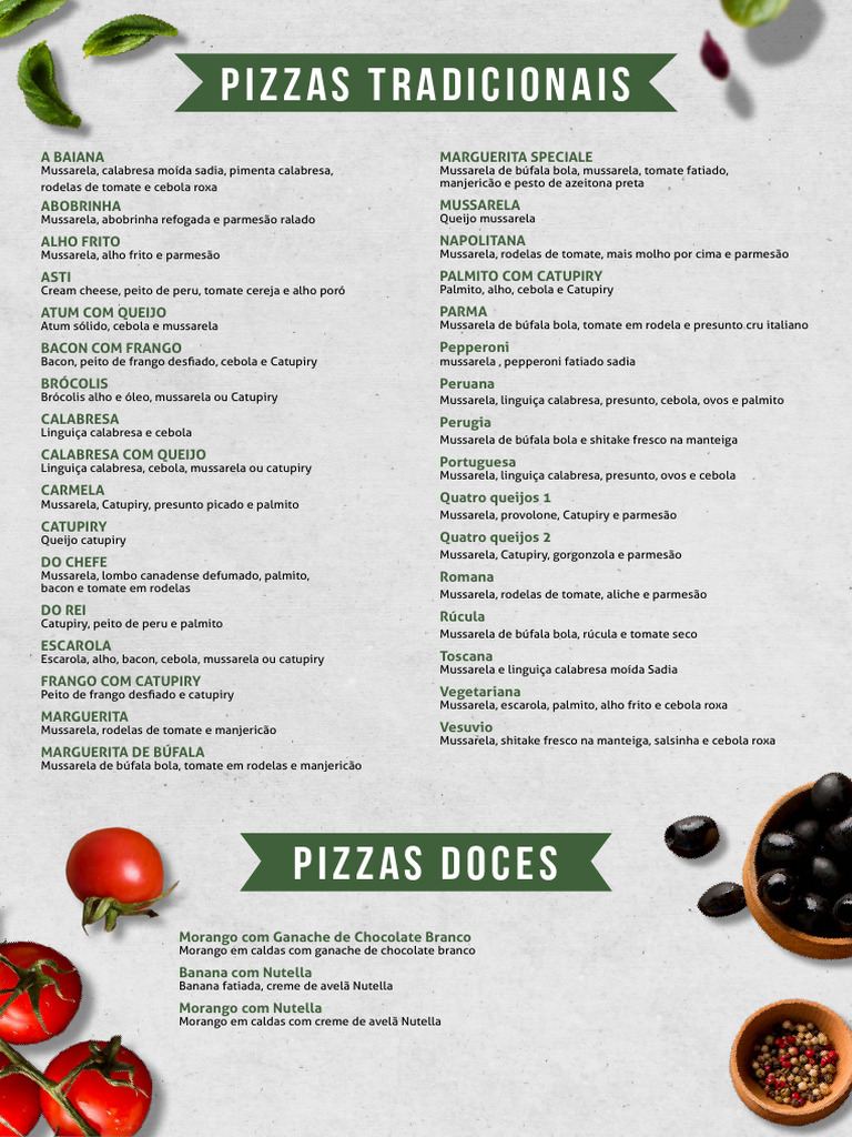Brócolis alho e óleo, mussarela ou Catupiry Mussarela, linguiça calabresa, presunto, cebola, ovos e palmito