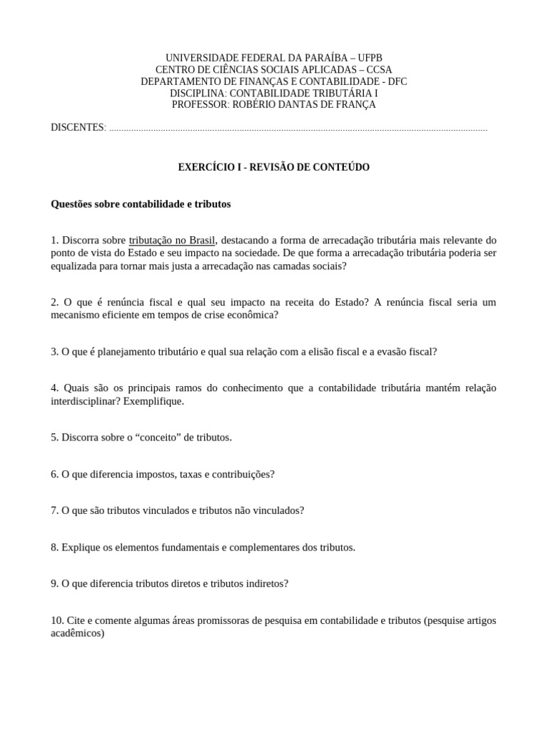 Questões sobre contabilidade e tributos