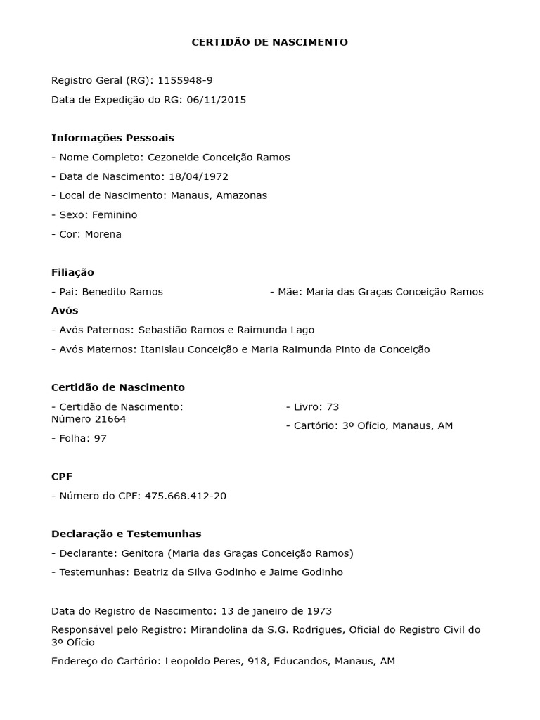 Data do Registro de Nascimento: 13 de janeiro de 1973