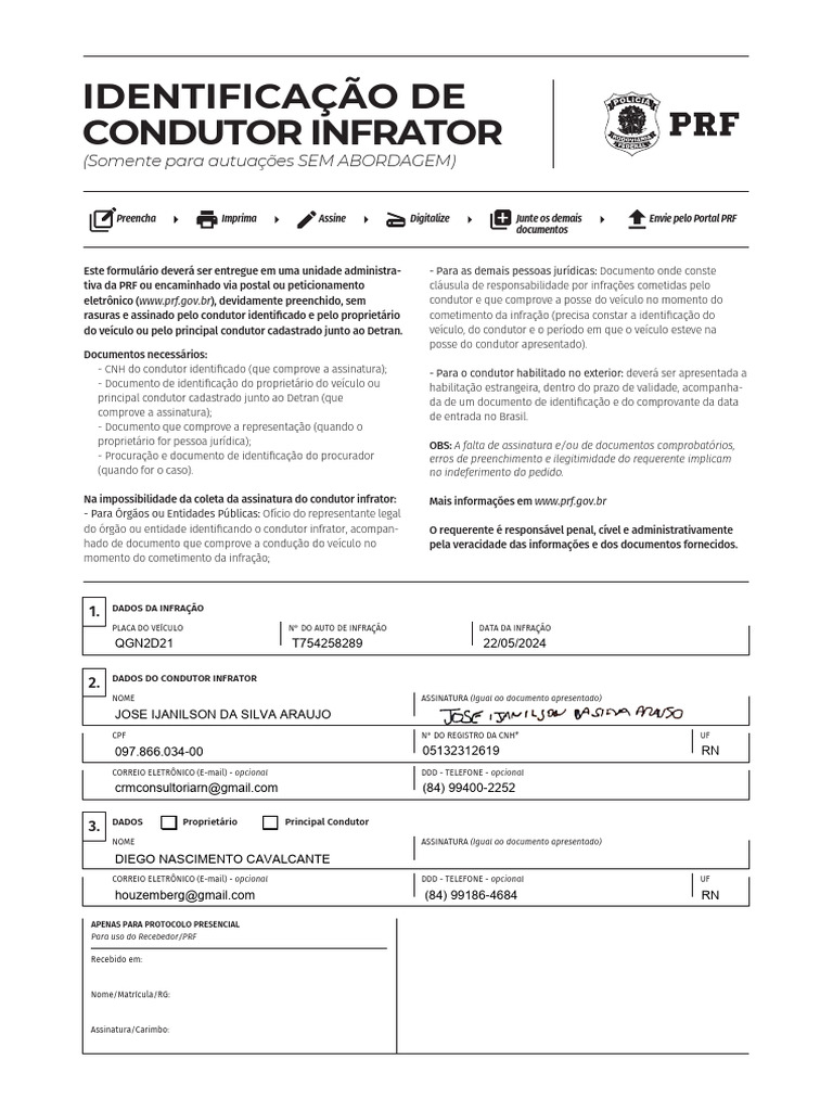 Preencha Imprima Assine Digitalize Junte os demais Envie pelo Portal PRF