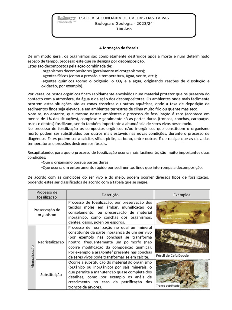 1. Refira qual é a característica apresentada por alguns seres vivos que facilita o processo de fossilização.