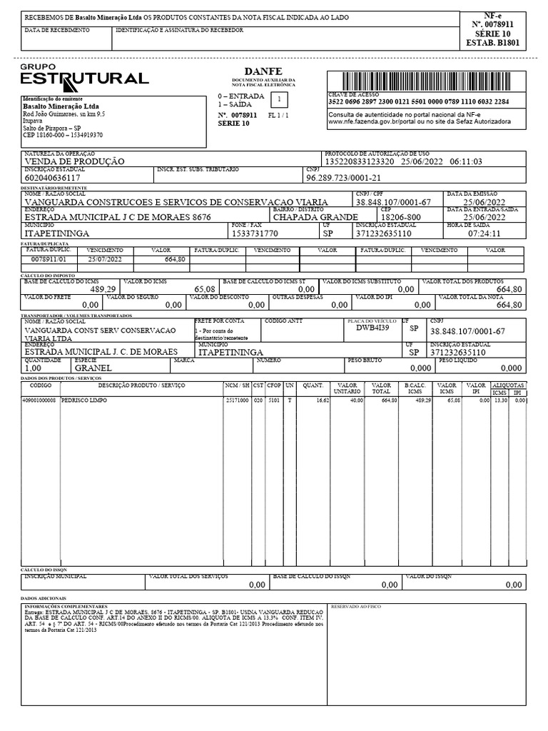 RECEBEMOS DE Basalto Mineração Ltda OS PRODUTOS CONSTANTES DA NOTA FISCAL INDICADA AO LADO NF-e