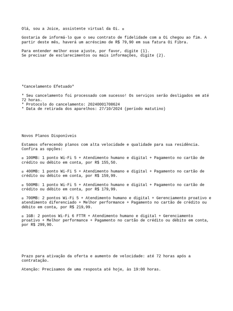 Olá, sou a Joice, assistente virtual da Oi.
