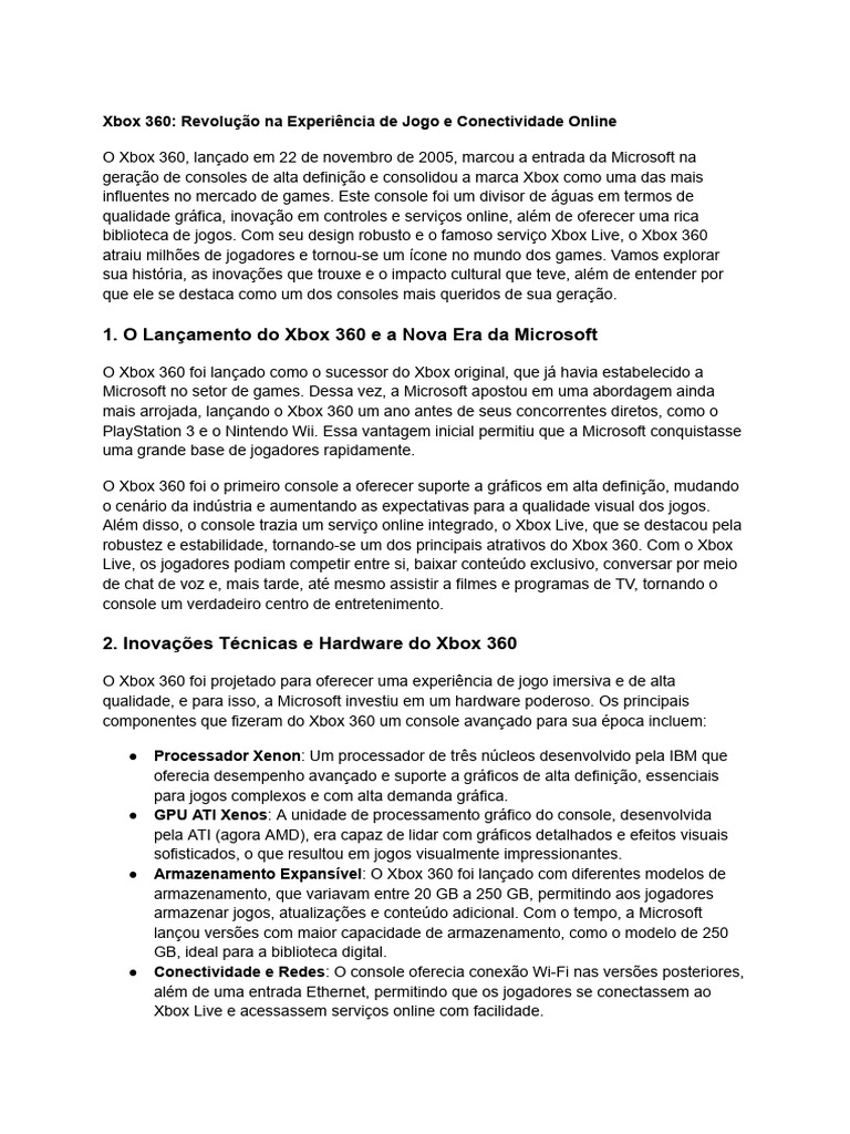 biblioteca de jogos. Com seu design robusto e o famoso serviço Xbox Live, o Xbox 360