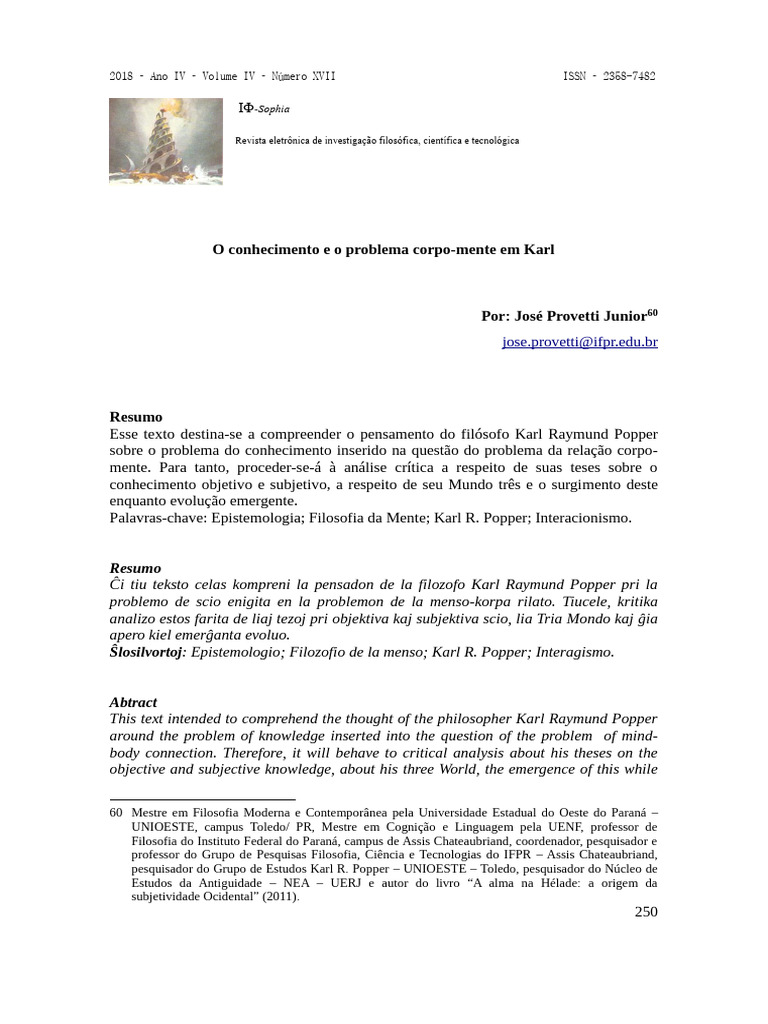 Keywords Epistemology; Philosophy of mind; Karl R. Popper; Interactionism..