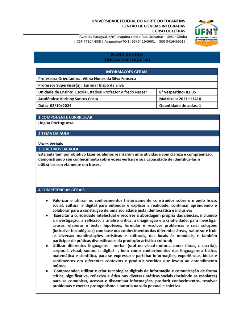 verbais e os tipos de vozes verbais. Adiante, será transcrito, no quadro, perguntas para os alunos