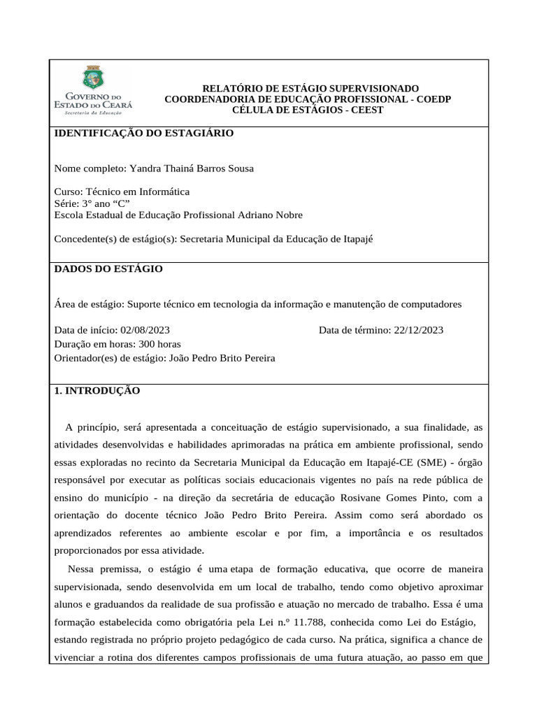 Área de estágio: Suporte técnico em tecnologia da informação e manutenção de computadores