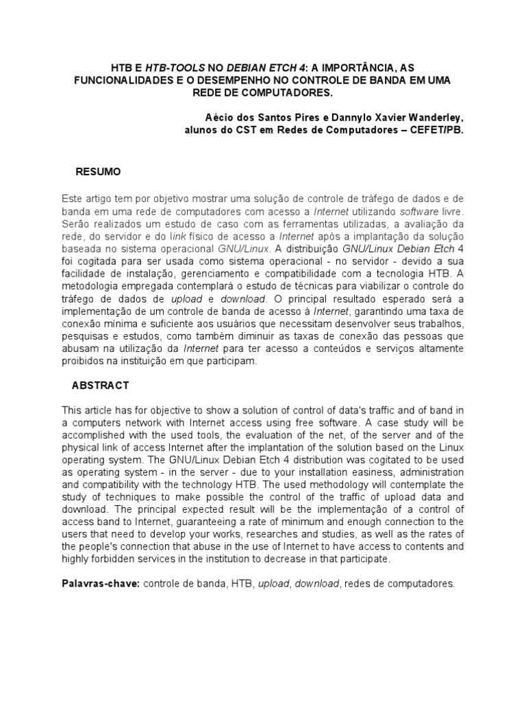 RESUMO Este artigo tem por objetivo mostrar uma soluo de controle de trfego de dados e de banda em uma rede de computadores com acesso a Internet utilizando software livre. Sero realizados um estudo de caso com as ferramentas utilizadas, a avaliao da rede, do servidor e do link fsico de acesso a Internet aps a implantao da soluo baseada no sistema operacional GNU/Linux. A distribuio GNU/Linux Debian Etch 4 foi cogitada para ser usada como sistema operacional - no servidor - devido a sua facilidade de instalao, gerenciamento e compatibilidade com a tecnologia HTB. A metodologia empregada contemplar o estudo de tcnicas para viabilizar o controle do trfego de dados de upload e download. O principal resultado esperado ser a implementao de um controle de banda de acesso Internet, garantindo uma taxa de conexo mnima e suficiente aos usurios que necessitam desenvolver seus trabalhos, pesquisas e estudos, como tambm diminuir as taxas de conexo das pessoas que abusam na utilizao da Internet para ter acesso a contedos e servios altamente proibidos na instituio em que participam. ABSTRACT This article has for objective to show a solution of control of data's traffic and of band in a computers network with Internet access using free software. A case study will be accomplished with the used tools, the evaluation of the net, of the server and of the physical link of access Internet after the implantation of the solution based on the Linux operating system. The GNU/Linux Debian Etch 4 distribution was cogitated to be used as operating system - in the server - due to your installation easiness, administration and compatibility with the technology HTB. The used methodology will contemplate the study of techniques to make possible the control of the traffic of upload data and download. The principal expected result will be the implementao of a control of access band to Internet, guaranteeing a rate of minimum and enough connection to the users that need to develop your works, researches and studies, as well as the rates of the people's connection that abuse in the use of Internet to have access to contents and highly forbidden services in the institution to decrease in that participate. Palavras-chave: controle de banda, HTB, upload, download, redes de computadores.
