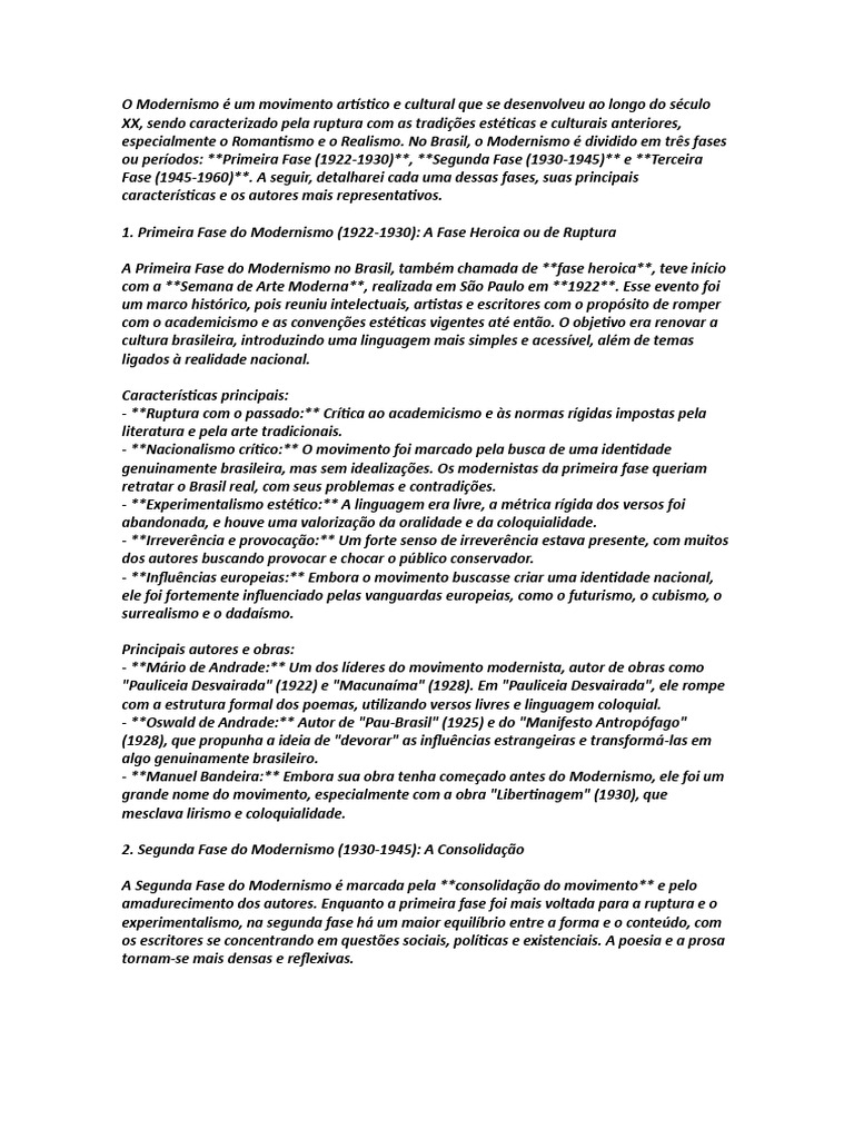 especialmente o Romantismo e o Realismo. No Brasil, o Modernismo é dividido em três fases