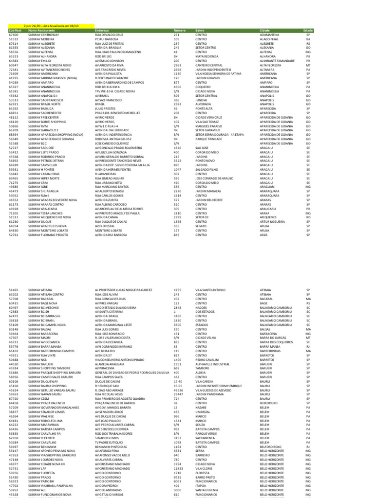 45624 SUBWAY GETULIO VARGAS BAURU R JOAO ABO ARRAGE 45536 VILA GUEDES DE AZEVEDO BAURU SP