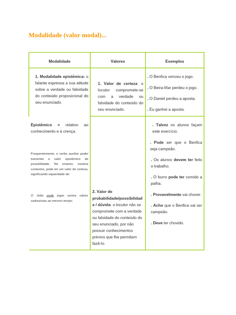 1. Modalidade epistémica: o . O Benfica venceu o jogo.