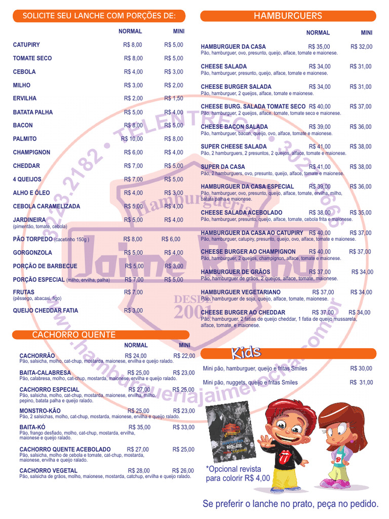 CEBOLA R$ 4,00 R$ 3,00 Pão, hamburguer, presunto, queijo, alface, tomate e maionese.