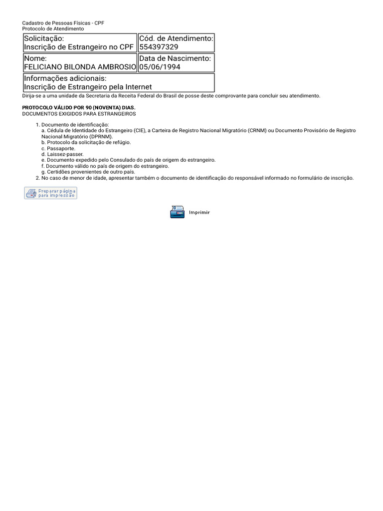 Dirija-se a uma unidade da Secretaria da Receita Federal do Brasil de posse deste comprovante para concluir seu atendimento.