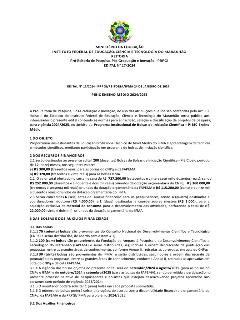 EDITAL N° 17/2024 - PRPGI/REITORIA/IFMA 24 DE JANEIRO DE 2024