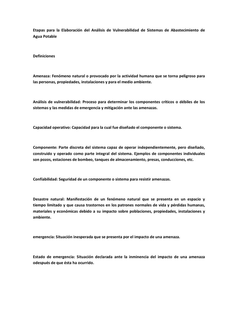Las actividades anteriores deben ser continuas y permanentes.grandes diámetros. En estas guías se pretende establecer una metodología fácil de aplicar que permita determinar con rapidez y eficacia los componentes críticos para elaborar el plan de mitigación y el plan de emergencia.1 Metodología de la American Water Works Association . 4. Se han propuesto varios métodos y algunos requieren un cálculo probabilístico complejo. Medición de la Vulnerabilidad Es necesario "medir" la vulnerabilidad en alguna forma para poder efectuar comparaciones entre componentes y dar prioridad a los componentes críticos o vulnerables al implementar las medidas de mitigación. 5. de tal manera que el plan de emergencia se mantenga vigente a lo largo del año y no como un simple documento a utilizar cuando se presenta una emergencia. Las dos metodologías que se han propuesto son las siguientes: 5.3 Tercer nivel o análisis de evaluación El análisis de vulnerabilidad en el tercer nivel presupone la vigencia de un plan de mitigación y de un plan de emergencia y se efectúa luego del impacto de una amenaza y luego de la realización de simulacros. etc. obras encaminadas a mejorar la redundancia de equipos y la flexibilidad operacional. La necesidad de estos estudios se identifica en el primer nivel de análisis. talleres y seminarios de análisis de vulnerabilidad. oportunidad en la cual se recopila la información disponible y se elaboran los términos de referencia para la contratación de consultores especializados.