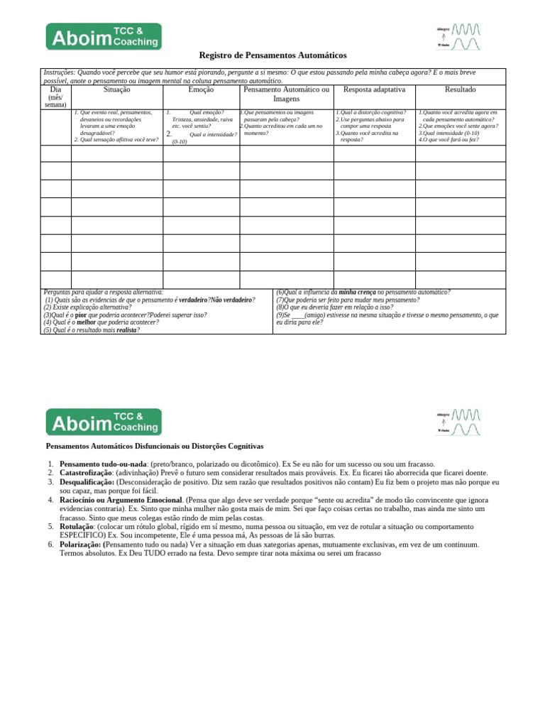 1. Que evento real, pensamentos, 1. Qual emoção? [Link] pensamentos ou imagens [Link] a distorção cognitiva? [Link] você acredita agora em