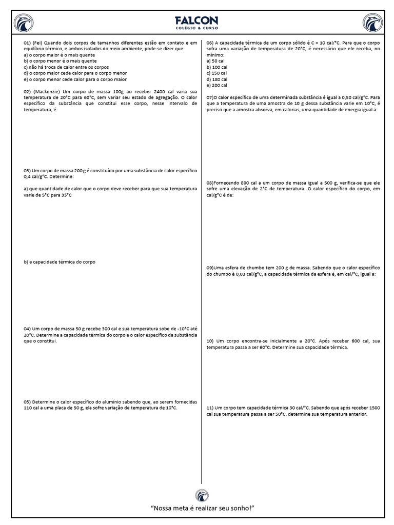 01) (Fei) Quando dois corpos de tamanhos diferentes estão em contato e em 06) A capacidade térmica de um corpo sólido é C = 10 cal/°C. Para que o corpo