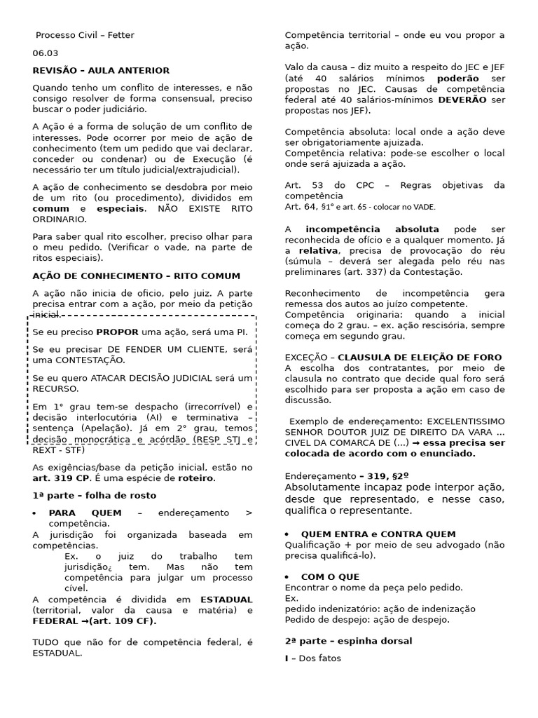 Processo Civil – Fetter Competência territorial – onde eu vou propor a