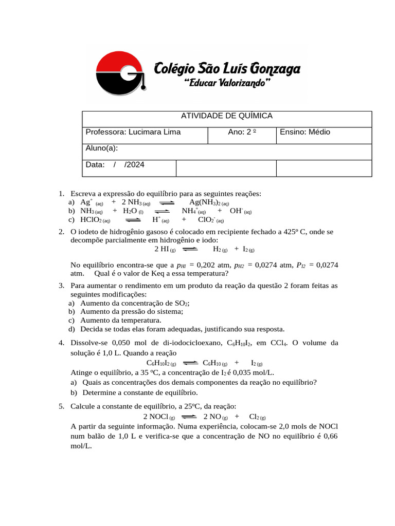 1. Escreva a expressão do equilíbrio para as seguintes reações: