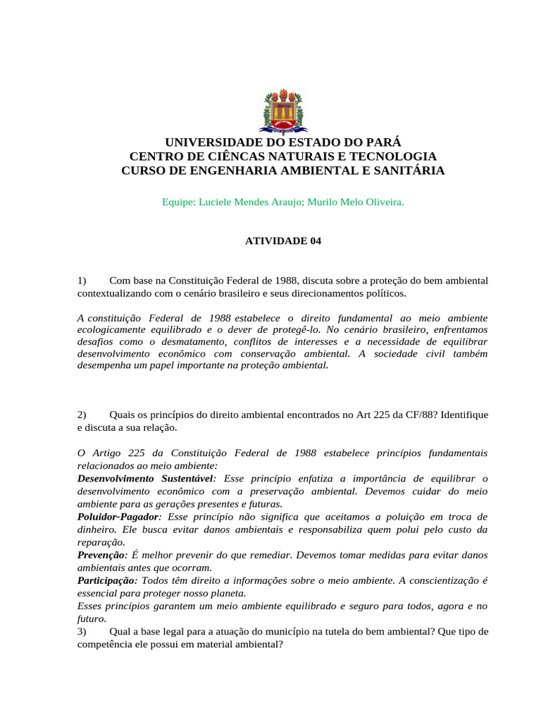 1) Com base na Constituição Federal de 1988, discuta sobre a proteção do bem ambiental