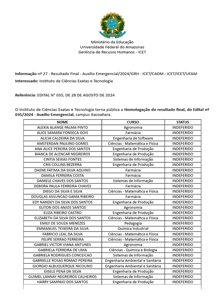 Informação nº 27 - Resultado Final - Auxílio Emergencial/2024/GRH - ICET/CADM - ICET/ICET/UFAM