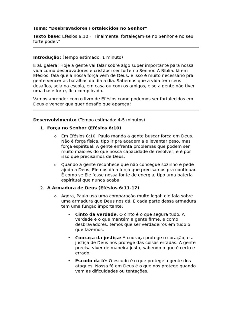 Texto base: Efésios 6:10 - “Finalmente, fortaleçam-se no Senhor e no seu