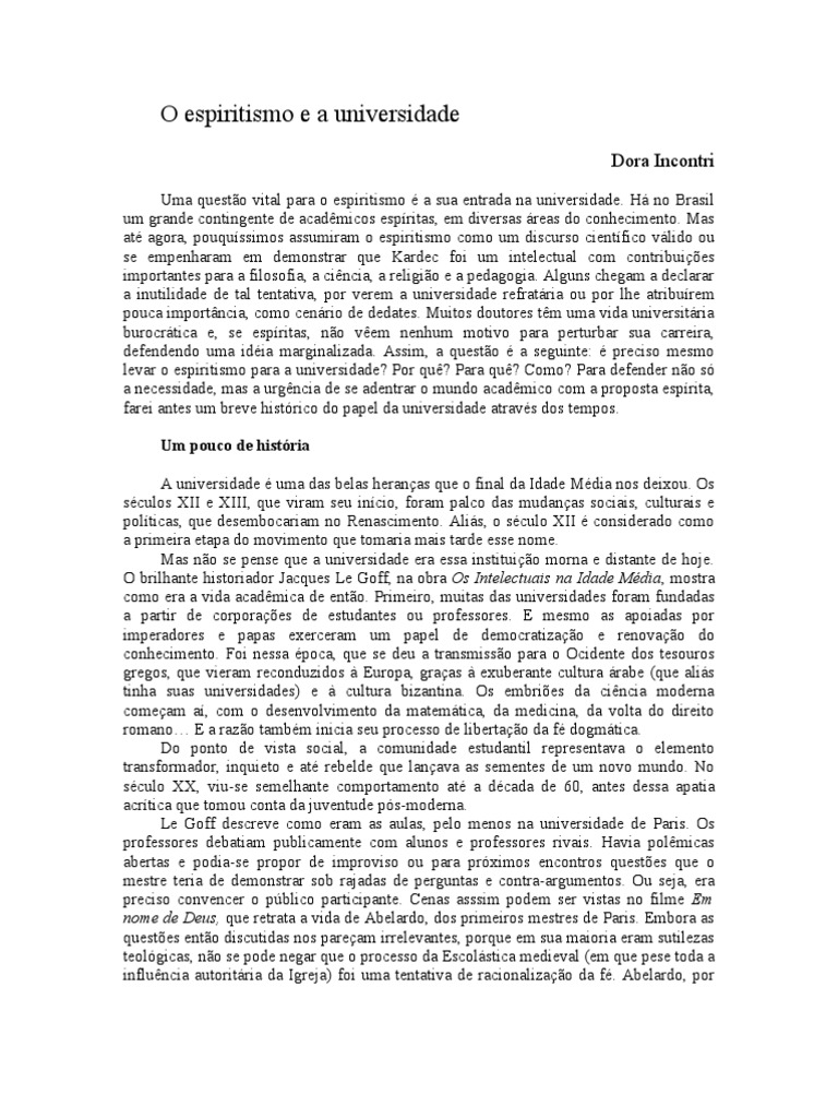 Uma questo vital para o espiritismo a sua entrada na universidade. H no Brasil um grande contingente de acadmicos espritas, em diversas reas do conhecimento. Mas at agora, pouqussimos assumiram o espiritismo como um discurso cientfico vlido ou se empenharam em demonstrar que Kardec foi um intelectual com contribuies importantes para a filosofia, a cincia, a religio e a pedagogia. Alguns chegam a declarar a inutilidade de tal tentativa, por verem a universidade refratria ou por lhe atriburem pouca importncia, como cenrio de dedates. Muitos doutores tm uma vida universitria burocrtica e, se espritas, no vem nenhum motivo para perturbar sua carreira, defendendo uma idia marginalizada. Assim, a questo a seguinte: preciso mesmo levar o espiritismo para a universidade? Por qu? Para qu? Como? Para defender no s a necessidade, mas a urgncia de se adentrar o mundo acadmico com a proposta esprita, farei antes um breve histrico do papel da universidade atravs dos tempos. Um pouco de histria A universidade uma das belas heranas que o final da Idade Mdia nos deixou. Os sculos XII e XIII, que viram seu incio, foram palco das mudanas sociais, culturais e polticas, que desembocariam no Renascimento. Alis, o sculo XII considerado como a primeira etapa do movimento que tomaria mais tarde esse nome. Mas no se pense que a universidade era essa instituio morna e distante de hoje. O brilhante historiador Jacques Le Goff, na obra Os Intelectuais na Idade Mdia, mostra como era a vida acadmica de ento. Primeiro, muitas das universidades foram fundadas a partir de corporaes de estudantes ou professores. E mesmo as apoiadas por imperadores e papas exerceram um papel de democratizao e renovao do conhecimento. Foi nessa poca, que se deu a transmisso para o Ocidente dos tesouros gregos, que vieram reconduzidos Europa, graas exuberante cultura rabe (que alis tinha suas universidades) e cultura bizantina. Os embries da cincia moderna comeam a, com o desenvolvimento da matemtica, da medicina, da volta do direito romano E a razo tambm inicia seu processo de libertao da f dogmtica. Do ponto de vista social, a comunidade estudantil representava o elemento transformador, inquieto e at rebelde que lanava as sementes de um novo mundo. No sculo XX, viu-se semelhante comportamento at a dcada de 60, antes dessa apatia acrtica que tomou conta da juventude ps-moderna. Le Goff descreve como eram as aulas, pelo menos na universidade de Paris. Os professores debatiam publicamente com alunos e professores rivais. Havia polmicas abertas e podia-se propor de improviso ou para prximos encontros questes que o mestre teria de demonstrar sob rajadas de perguntas e contra-argumentos. Ou seja, era preciso convencer o pblico participante. Cenas asssim podem ser vistas no filme Em nome de Deus, que retrata a vida de Abelardo, dos primeiros mestres de Paris. Embora as questes ento discutidas nos paream irrelevantes, porque em sua maioria eram sutilezas teolgicas, no se pode negar que o processo da Escolstica medieval (em que pese toda a influncia autoritria da Igreja) foi uma tentativa de racionalizao da f. Abelardo, por
