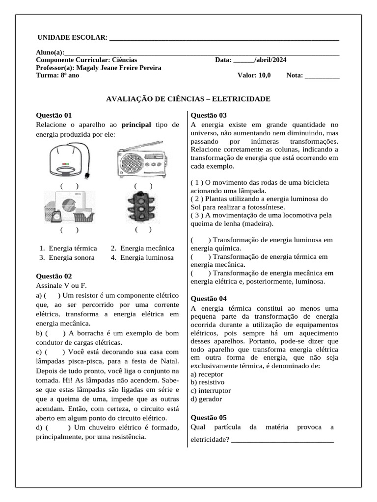 AVALIAÇÃO DE CIÊNCIAS – ELETRICIDADE