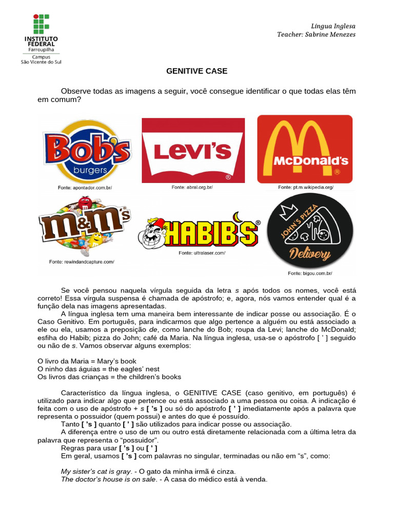 Característico da língua inglesa, o GENITIVE CASE (caso genitivo, em português) é
