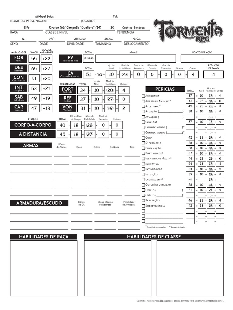 Destreza 65 +27 TOTAL Nível Habilidade Armadura Escudo Tamanho Outros Outros DE DANO