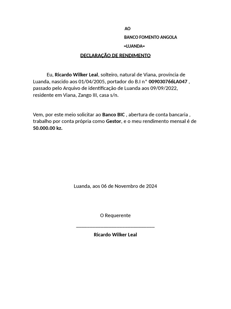 Eu, Ricardo Wilker Leal, solteiro, natural de Viana, província de