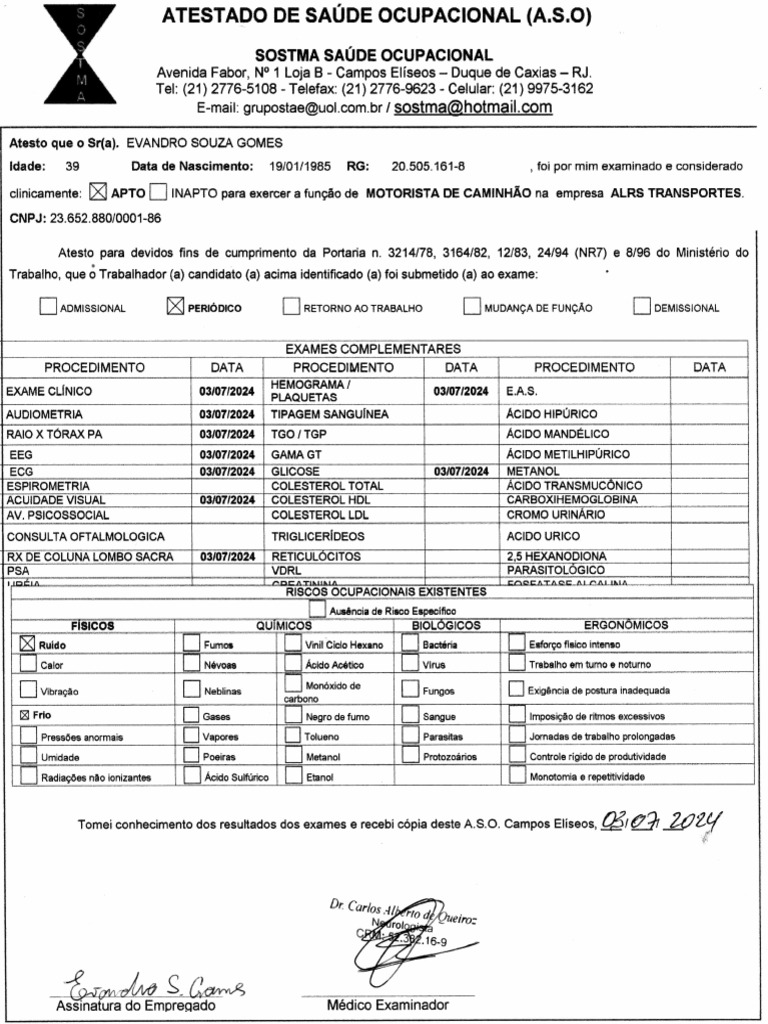 clinicamente: APTO INAPTO para exercer a função de MOTORISTA DE CAMINHÃO na empresa ALRS TRANSPORTES.