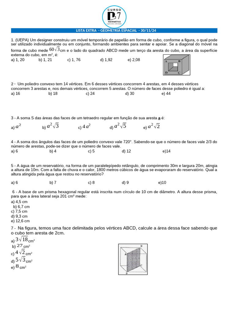 LISTA EXTRA - GEOMETRIA ESPACIAL - 30/11/24